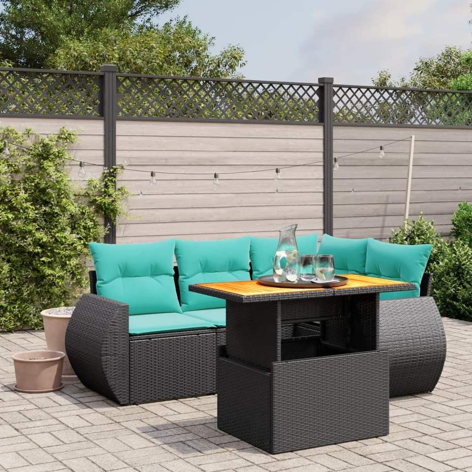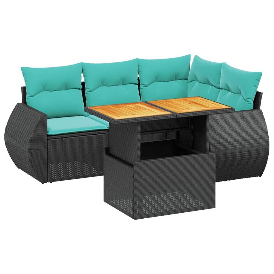 ชุดโซฟาลานบ้านหวายโพลีสีดำ 5 ชิ้นพร้อมเบาะรองนั่ง เฟอร์นิเจอร์กลางแจ้งที่หรูหรา