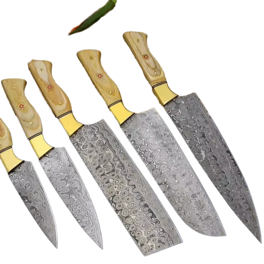 ชุดมีดทำครัวเหล็กดามัสกัส 5 ชิ้น ด้ามไม้ คุณภาพพรีเมียม สำหรับขายส่ง B2B รับผลิตแบบ OEM ความแข็ง 60 HRC