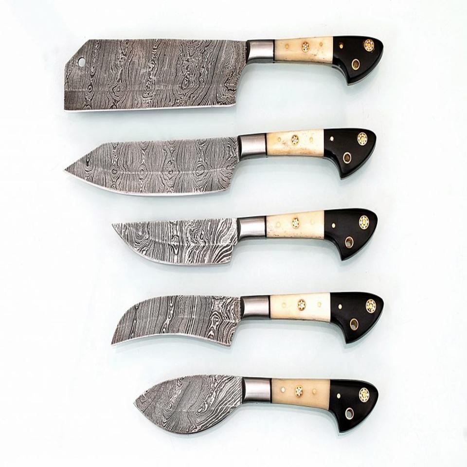 ชุดมีดทำครัวเหล็กดามัสกัส5ชิ้นพร้อมแผ่นกระดูกขาโมเสกกระเป๋าใส่หนัง OEM ออกแบบได้ตามต้องการ