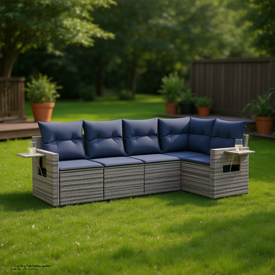 ชุดโซฟาสวนหวายโพลีสีเทา 5 ชิ้นพร้อมเบาะรองนั่งเฟอร์นิเจอร์กลางแจ้ง
