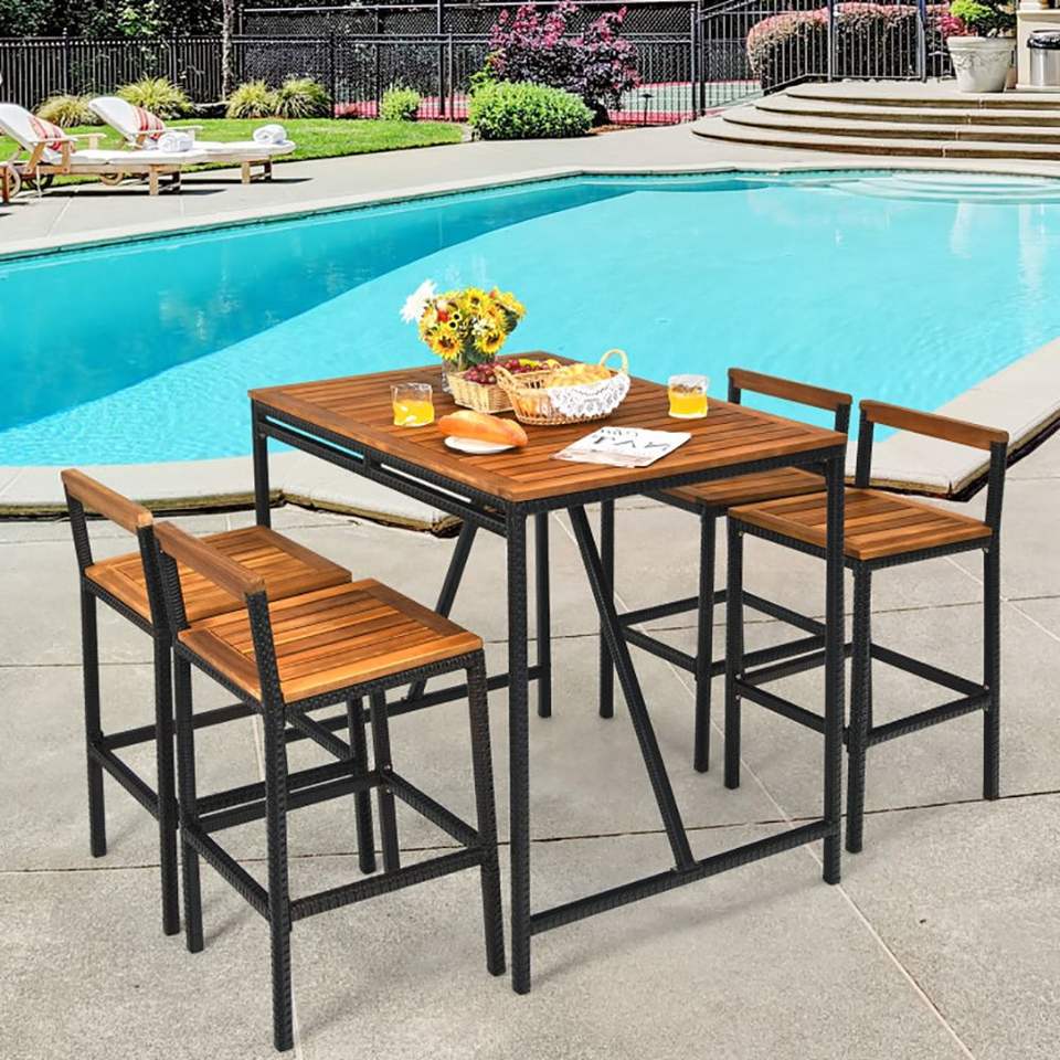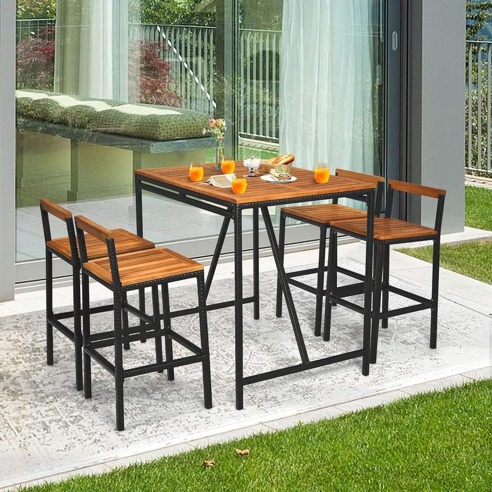 5-Piece Outdoor Acacia Wood and PE Rattan Bar Set Elegant Garden Furniture Collection