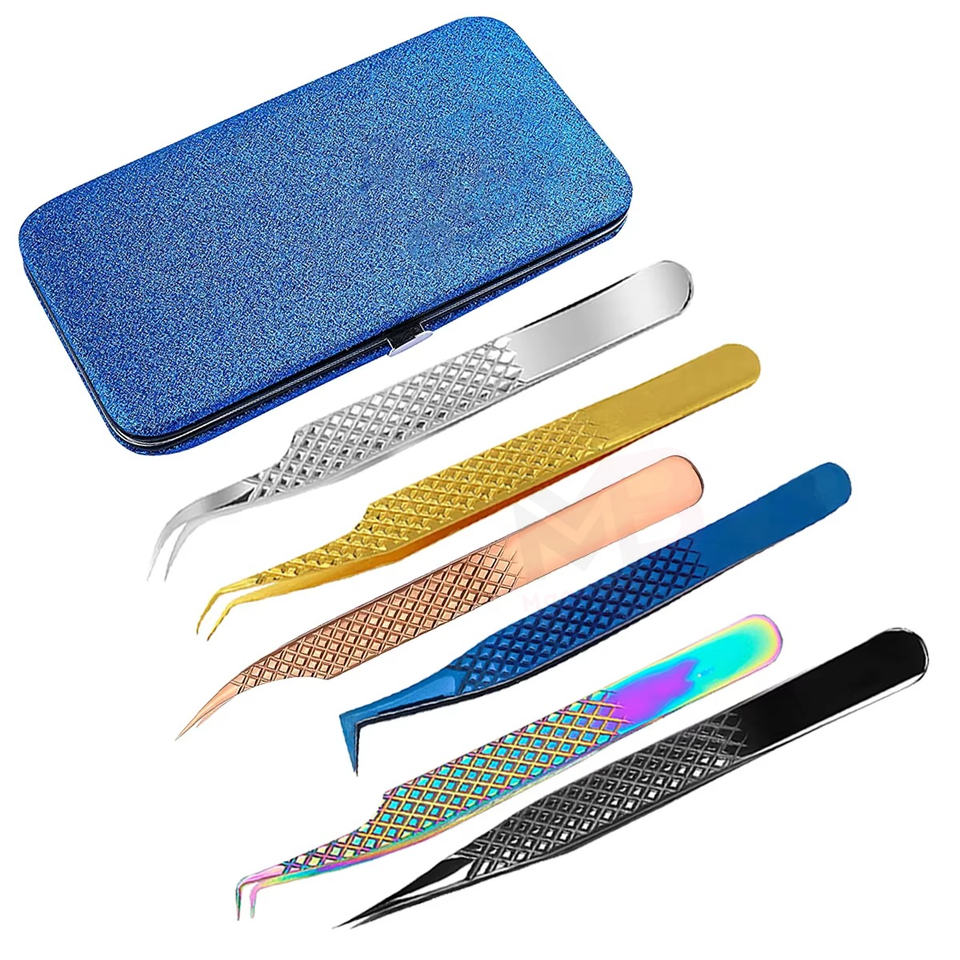 ชุดแหนบต่อขนตา 5 ชิ้น ปลายตรงและโค้ง แหนบต่อขนตาเคลือบไทเทเนียมสีรุ้ง