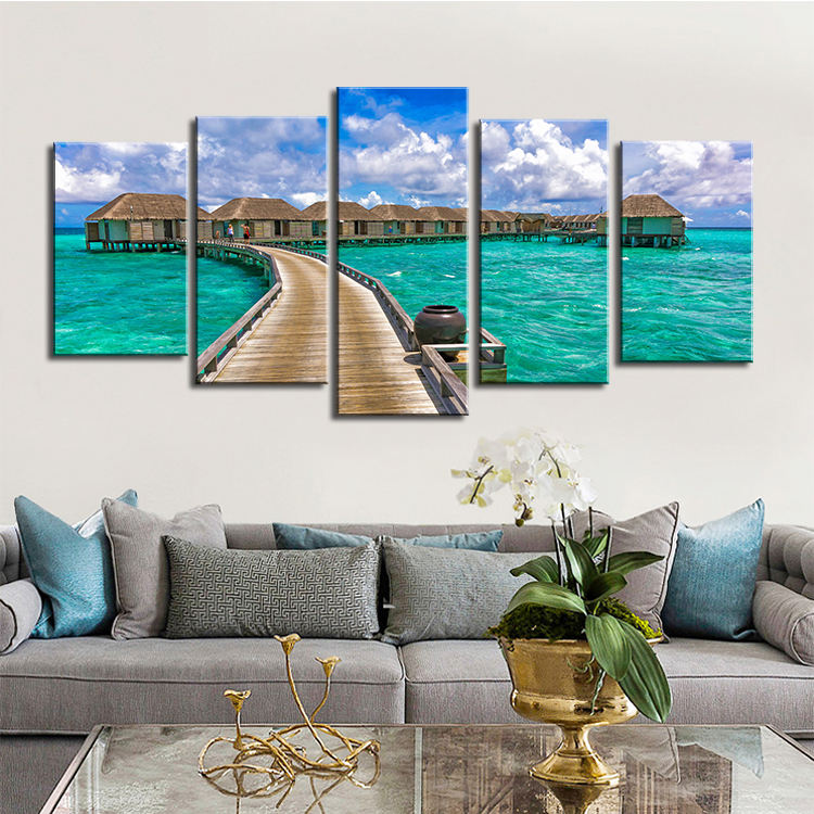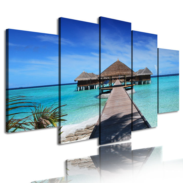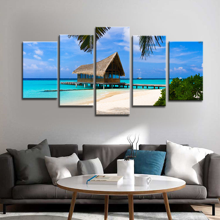 5 Pieces Sea Scenery Cottage Canvas Pictures Tropical Beach Canvas Painting Wall Art HD Print Maldives Seascape Paintings