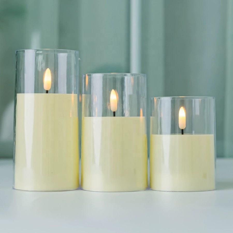 ชุดเทียน LED สำหรับตกแต่งบ้าน5เสาแก้วสีขาวไร้เปลวไฟจำลองไฟ LED