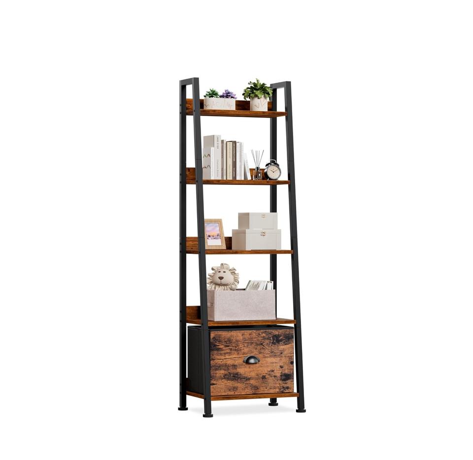 ชั้นวางหนังสือแบบ 5 ชั้น พร้อมลิ้นชักผ้าแบบถอดได้ วัสดุไม้และโลหะ ชั้นวางของแบบตั้งพื้นสำหรับห้องนั่งเล่นและบ้าน