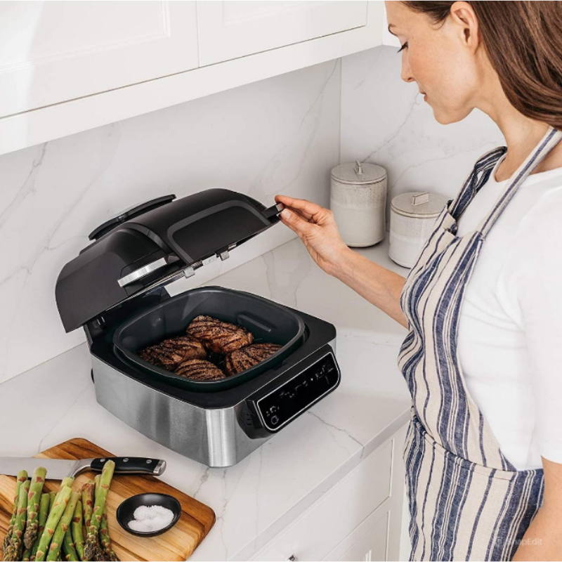 เตาย่างอเนกประสงค์ 5-in-1 พร้อมฟังก์ชั่นทอดไร้น้ำมัน อบ ย่าง และอบแห้ง สีดำ/เงิน ตะกร้าทอดขนาด 4 ควอร์ต และหม้อปรุงอาหารขนาด 6 ควอร์ต