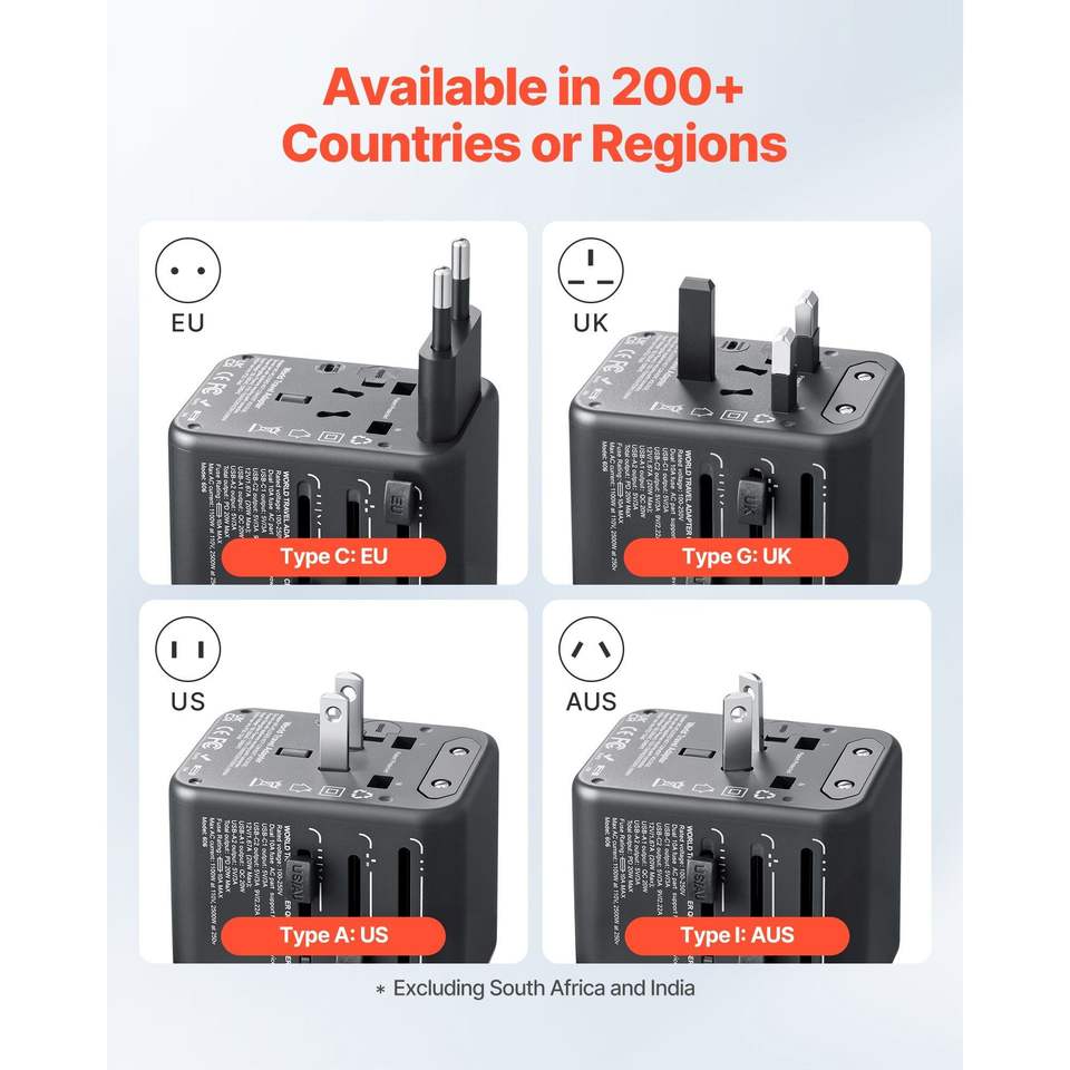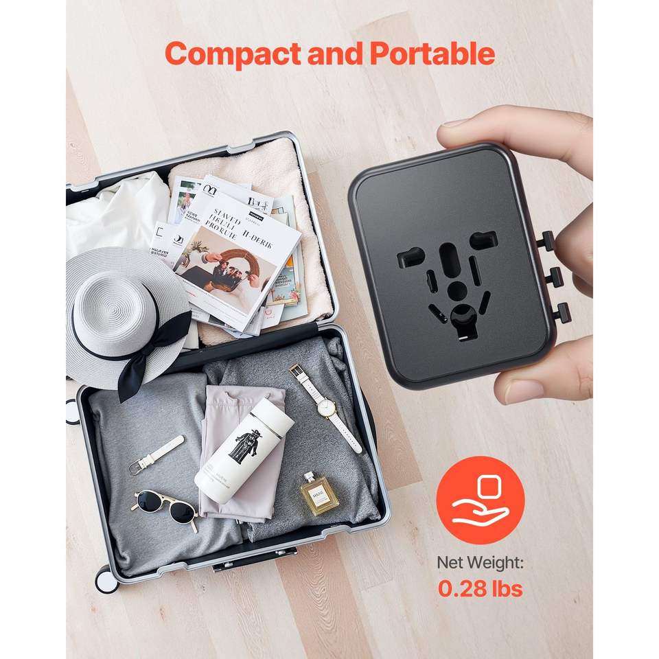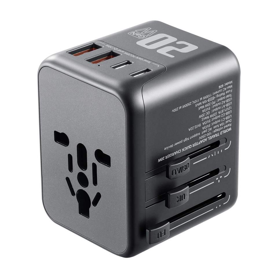 อะแดปเตอร์แปลงไฟแบบ 5-in-1 สำหรับเดินทาง 2 พอร์ต USB-C และ 2 พอร์ต USB-A 1 ช่องเสียบไฟ AC อะแดปเตอร์แปลงไฟนานาชาติแบบยุโรป 4 หัวปลั๊กแบบต่างๆ