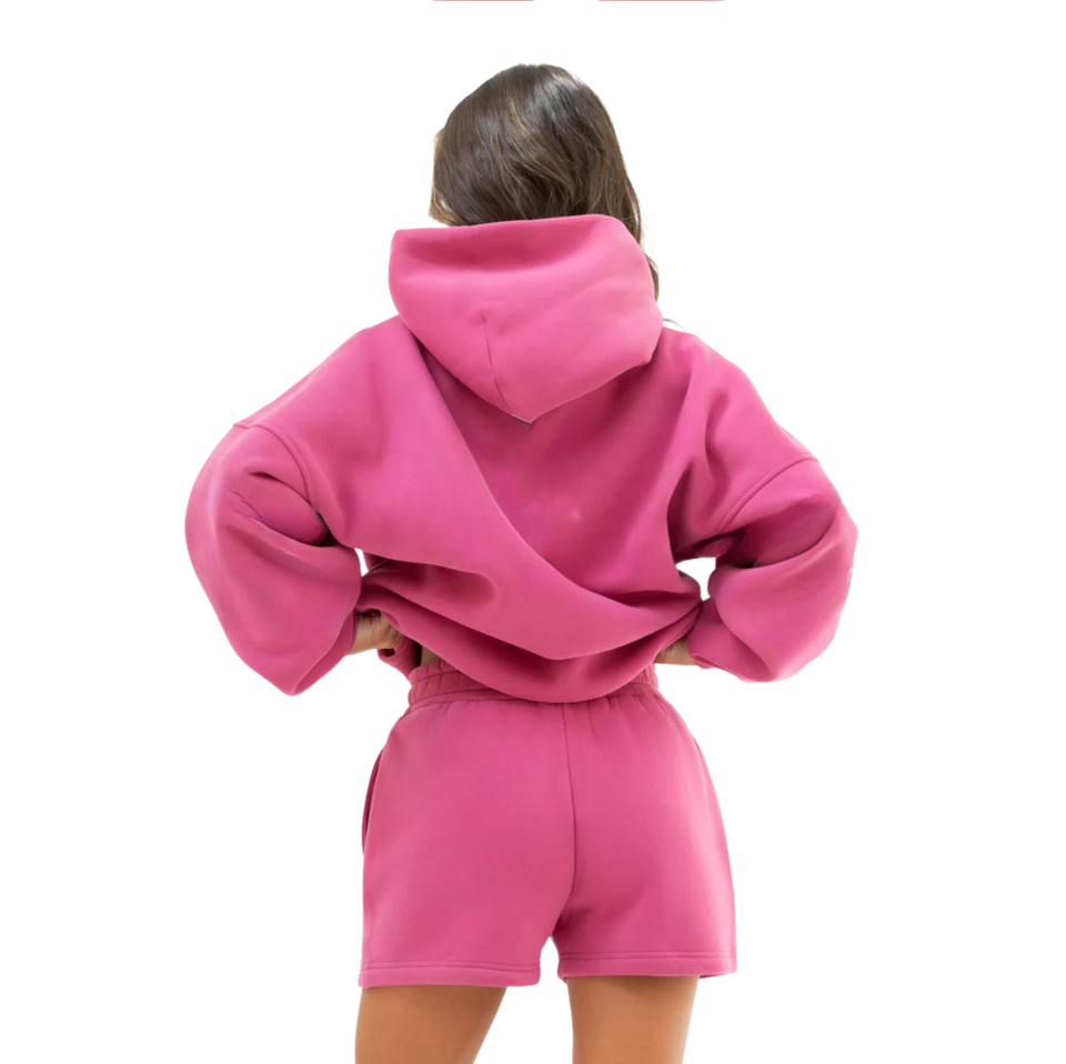 เสื้อฮู้ดดี้โอเวอร์ไซส์สีชมพูสด ผ้าคอตตอน 50% โพลีเอสเตอร์ 50% สไตล์สตรีทแวร์ ทรงหลวม ไหล่ตก ใส่สบาย เหมาะสำหรับฤดูหนาว