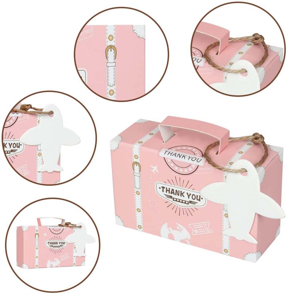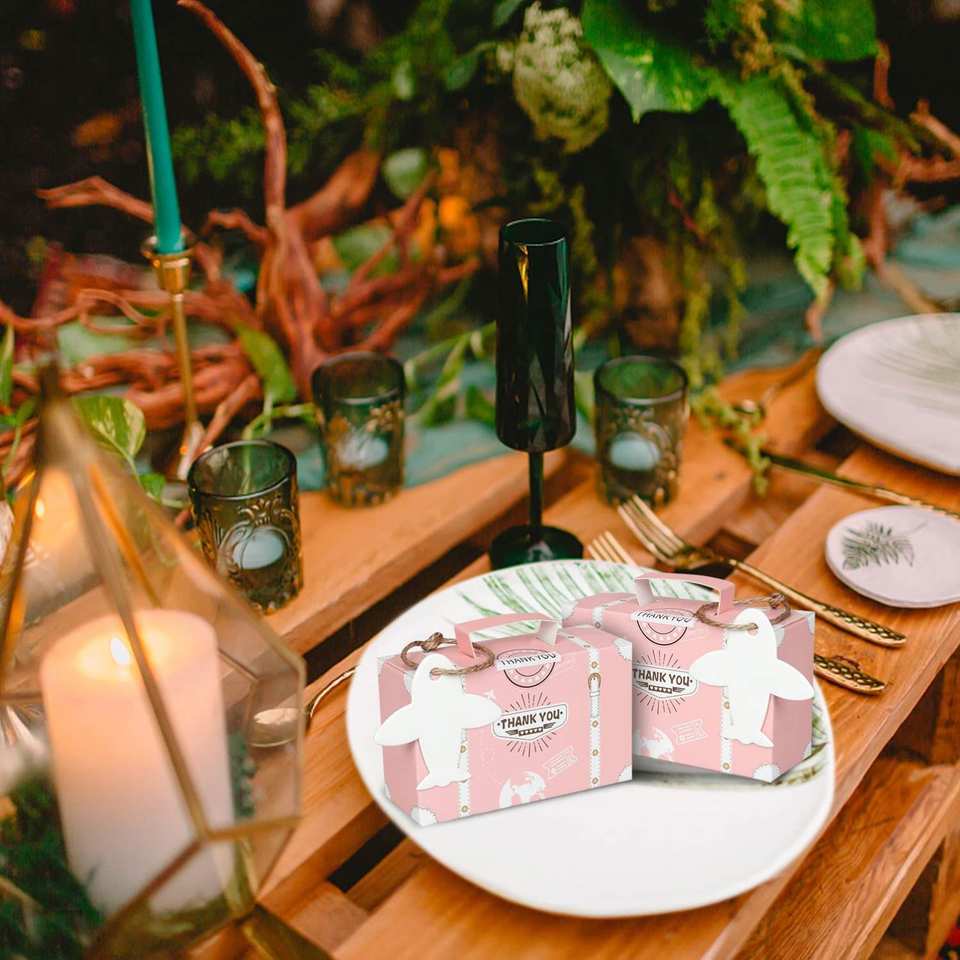 กล่องของชำร่วยงานแต่งงานธีมการเดินทางสีชมพู 50 กล่อง กล่องใส่ขนมรูปกระเป๋าเดินทาง กล่องกระดาษสำหรับใส่อาหาร