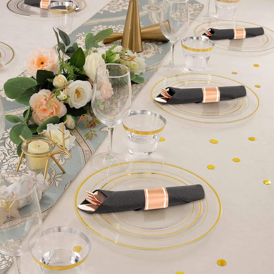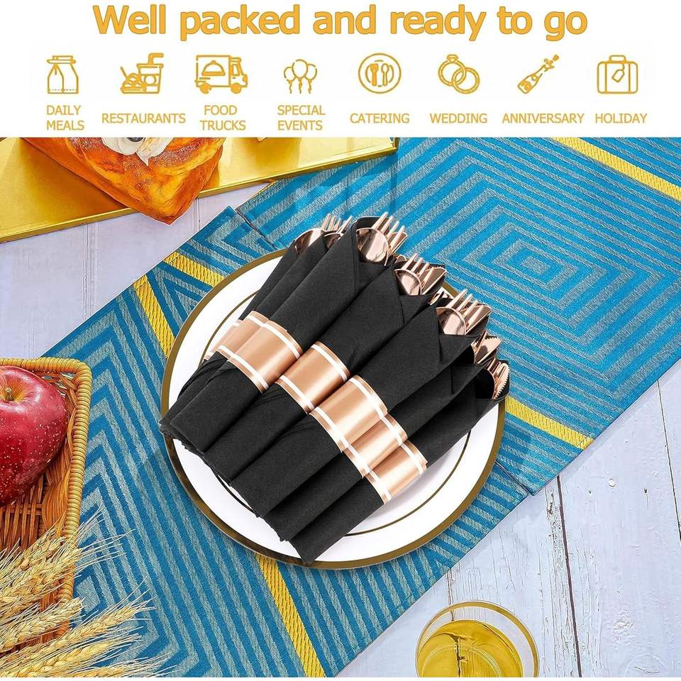 ชุดช้อนส้อมพลาสติกสีโรสโกลด์แบบใช้แล้วทิ้ง 50 ชุด บรรจุ 50 ชิ้น (ส้อม 50 ชิ้น ช้อน 50 ชิ้น มีด 50 ชิ้น) พร้อมผ้าเช็ดปาก