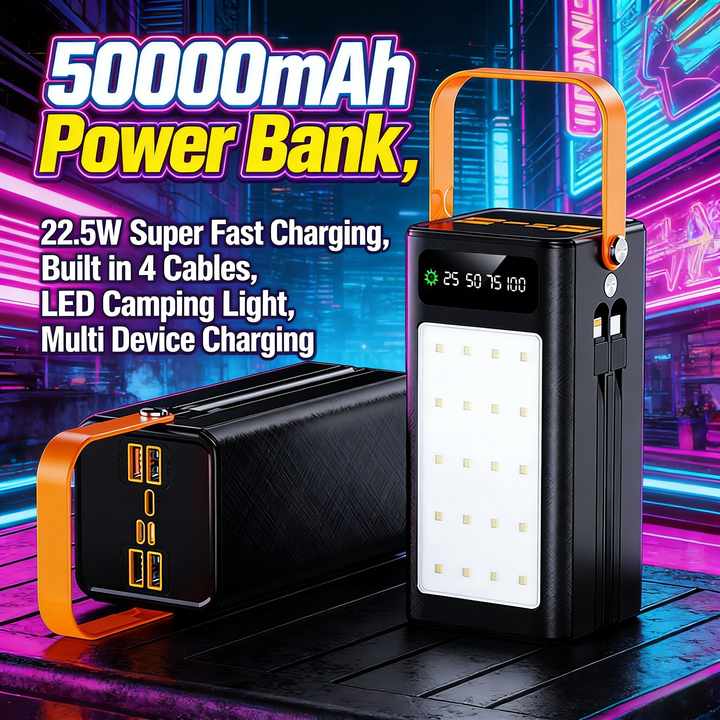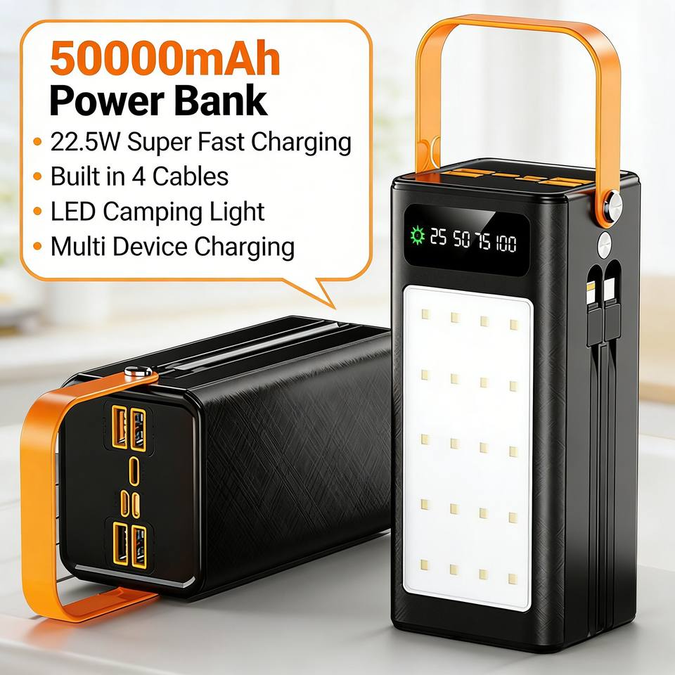 50000mAh Portable Power Bank Built-in 4 Cable LED Camping Light 120W Super Fast Charging LED Digital Display ABS Material