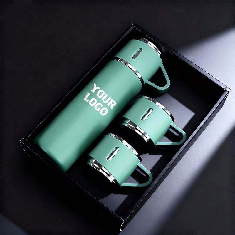 ชุดกระติกน้ำสุญญากาศสแตนเลสขนาด 500 มล. พิมพ์โลโก้ตามสั่ง พร้อมแก้ว 2 ใบ เหมาะสำหรับกิจกรรมองค์กร ของขวัญทางธุรกิจ