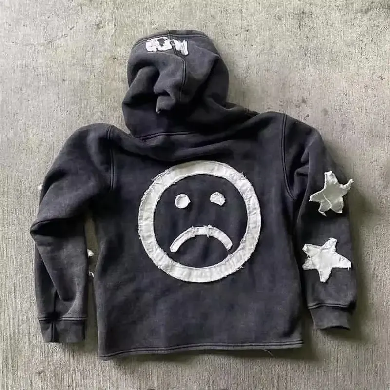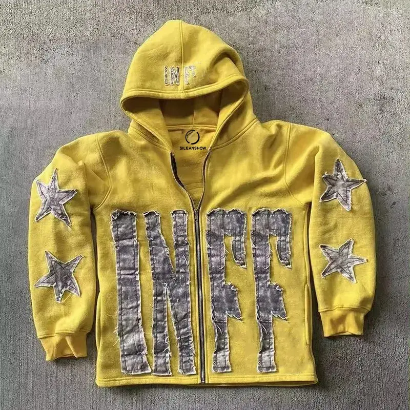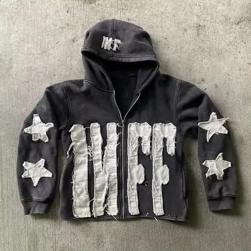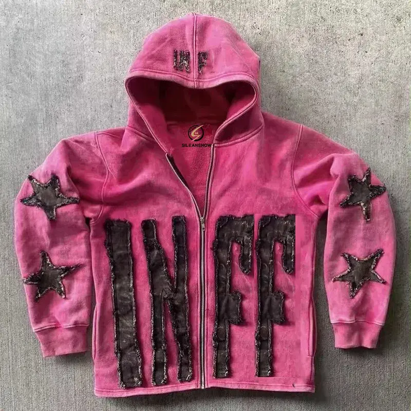 เสื้อฮู้ดผู้ชายทรงบ็อกซี่มีซิปรูดผ้าปะติดที่ซีดจางพิมพ์ลายโลโก้ออกแบบได้ตาม500gsm