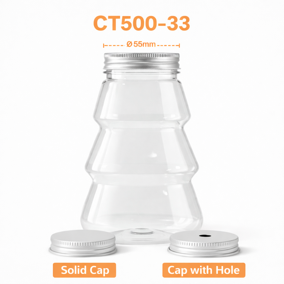 ขวดพลาสติก PET ขนาด 500 มล. ลายต้นคริสต์มาส ฝาเกลียวทรงกรวย สำหรับบรรจุภัณฑ์น้ำผลไม้และเครื่องดื่ม ส่งออกไปยังเอเชีย ฝาอลูมิเนียม