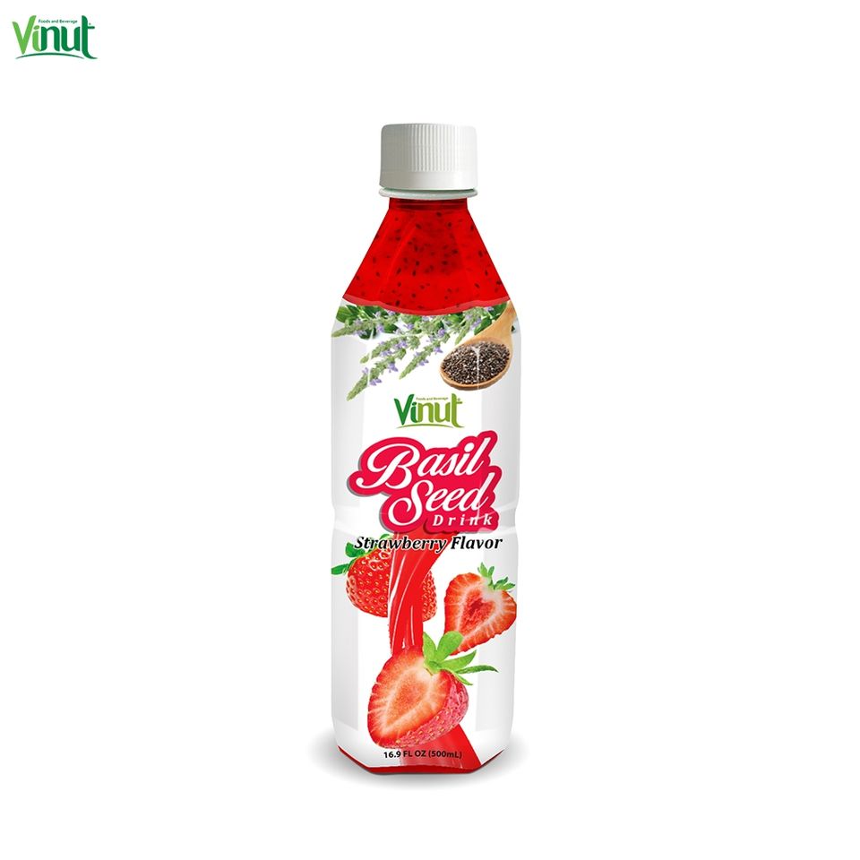 เครื่องดื่มเมล็ดโหระพาขวด500มล. พร้อมน้ำสตรอเบอร์รี่กลิ่นรสใบโหระพา