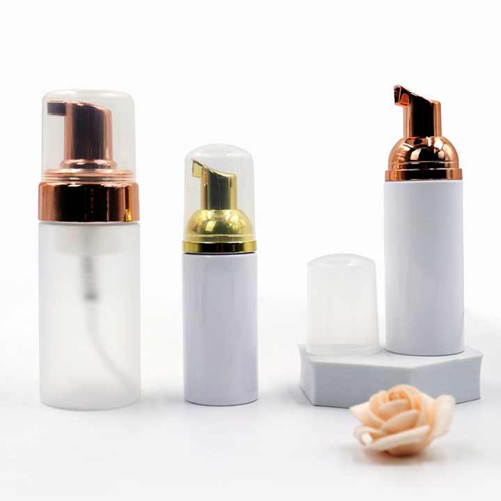 ขวดโฟม PET ขนาดเล็ก 50 มล. 100 มล. พร้อมหัวปั๊มพลาสติกสีดำ สำหรับสบู่เหลวและผลิตภัณฑ์ทำความสะอาดผิวหน้า