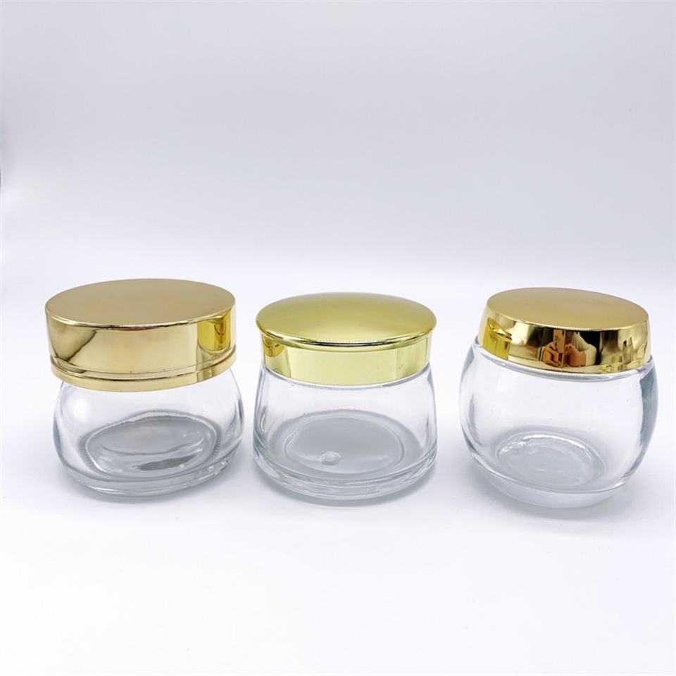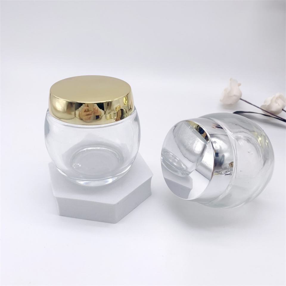 ขวดแก้วใสขนาด 50 กรัม 100 กรัม สำหรับครีมทาตัว/ใบหน้า/รอบดวงตา ปากกว้าง ทรงกลม พร้อมฝาโลหะสีเงิน/สีทอง