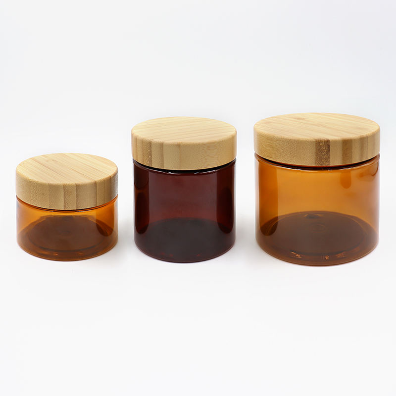 กระปุกสครับขัดผิว 50 กรัม 150 กรัม 250 กรัม 500 กรัม บรรจุภัณฑ์เครื่องสำอางสัตว์เลี้ยง กระปุกสีน้ำตาลอำพันพร้อมฝาไม้ไผ่