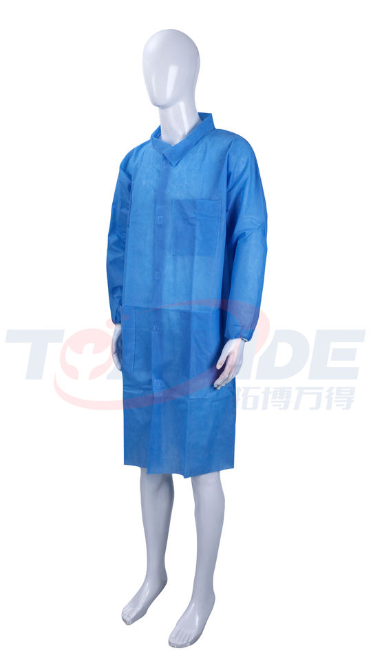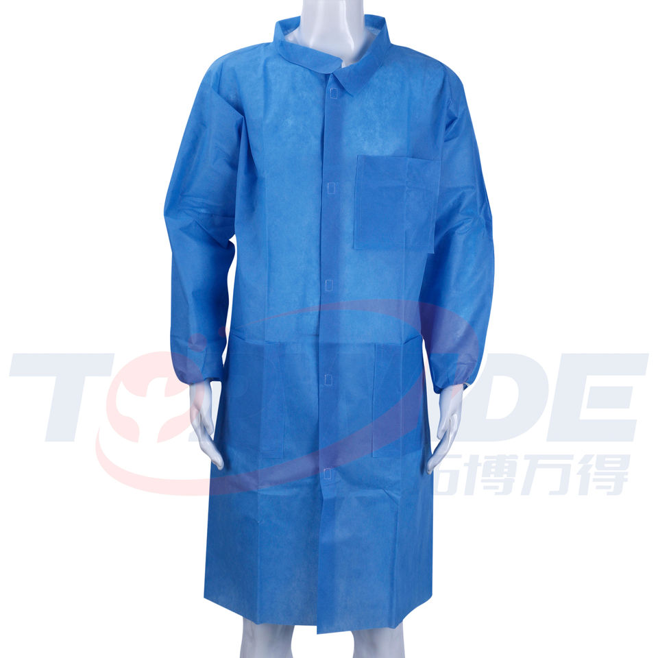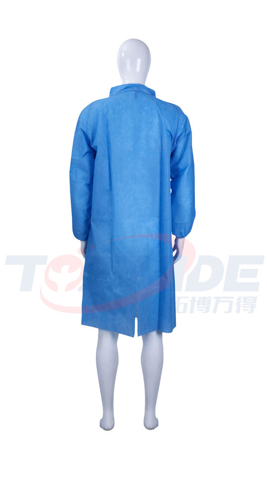 50gsm เสื้อโค้ทมาตรฐาน spp สีขาว/น้ำเงินคอเสื้อโค้ทพลาสติกยืดหยุ่นได้แบบแบนมีห่วง5จุดเสื้อผ้าป้องกันทางการแพทย์