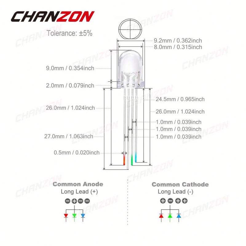 ขั้ว:ขั้วบวก (ส่วนที่ยาวกว่า) | แคโทด (ส่วนที่สั้นกว่า)