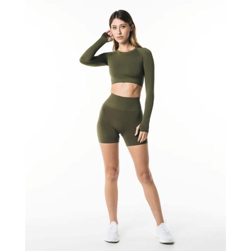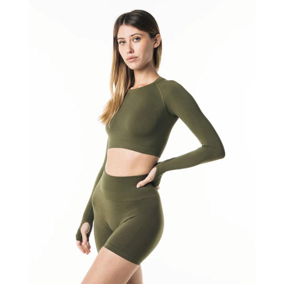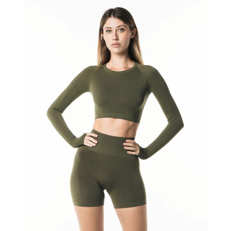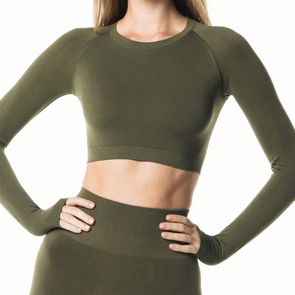 Raglan Cut เสื้อเชิ้ตแขนยาวทรงครอปของผู้หญิง,เสื้อเบลาส์ไร้รอยต่อขอบคอลูกเรือโพลีอะไมด์51% โพลีเอสเตอร์38% 11%