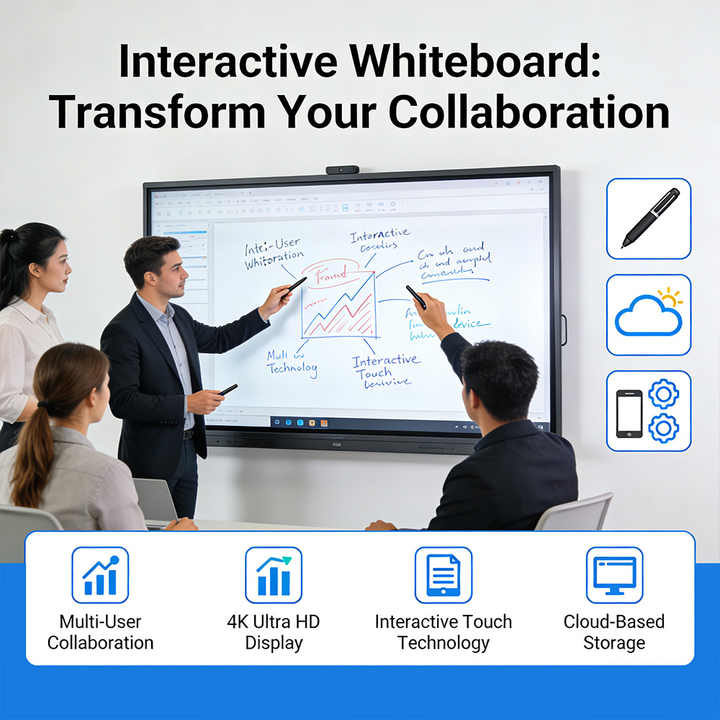 หน้าจอสัมผัสแบบอินเทอร์แอคทีฟขนาด 55 75 นิ้ว ความละเอียด 4K ไวท์บอร์ดอัจฉริยะสำหรับการสอนในโรงเรียน การประชุมในสำนักงาน และการแสดงผล