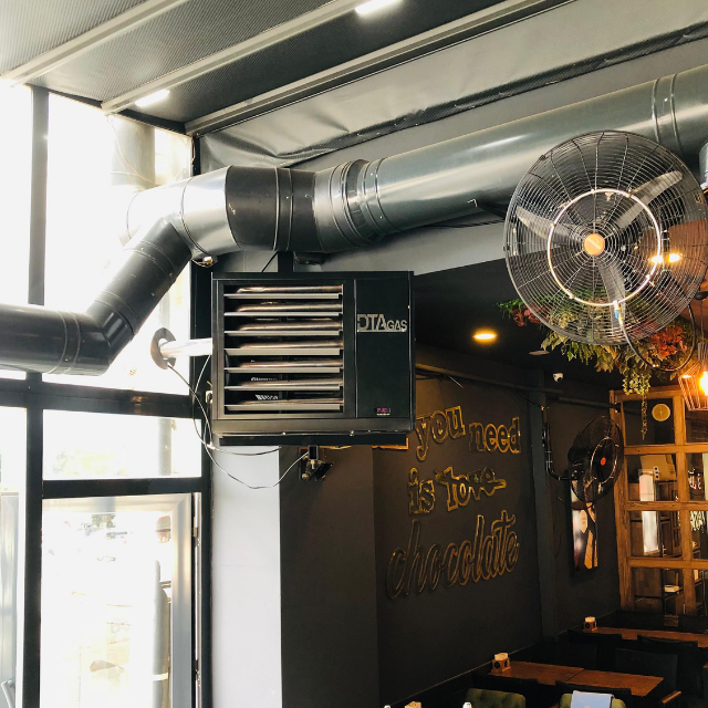 เครื่องทำความร้อนอากาศร้อนแบบติดผนัง 55 กิโลวัตต์ ใช้แก๊สธรรมชาติ ทนทาน หัวเผาสแตนเลส พร้อมระบบป้องกันความร้อนเกิน สำหรับงานอุตสาหกรรมกลางแจ้ง