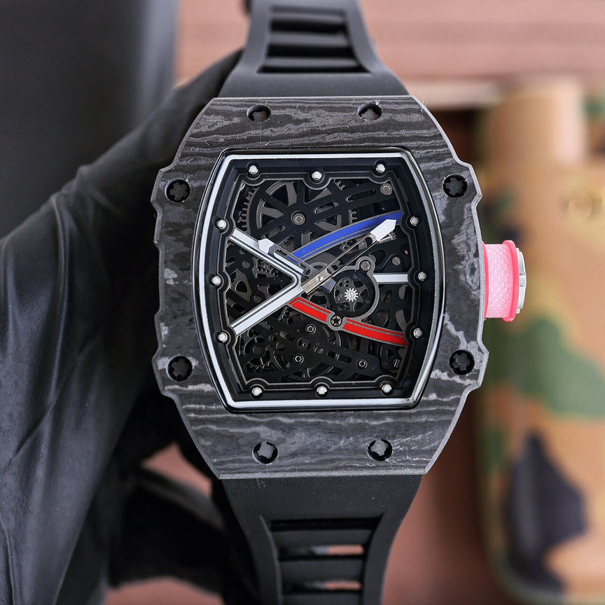 นาฬิกาข้อมือผู้ชาย ระบบออโตเมติก ดีไซน์หรูหรา สปอร์ต สายยางสีแดงระบายอากาศ ตัวเรือนคาร์บอนไฟเบอร์ โครงกระดูก รุ่นขายดีเกรด 5A