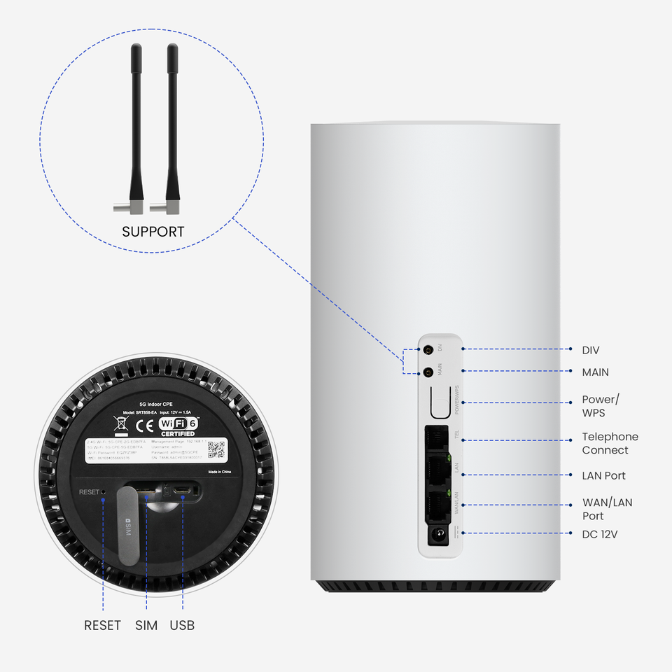 เราเตอร์ซิม 5G CPE, 5G CPE, SA/NSA SDX65 รองรับ WiFi6 แบบดูอัลแบนด์ 2.4G/5G รองรับ VoIP/VoLTE/VoNR พอร์ต Gigabit LAN และ TS-9 เหมาะสำหรับใช้งานภายในอาคาร