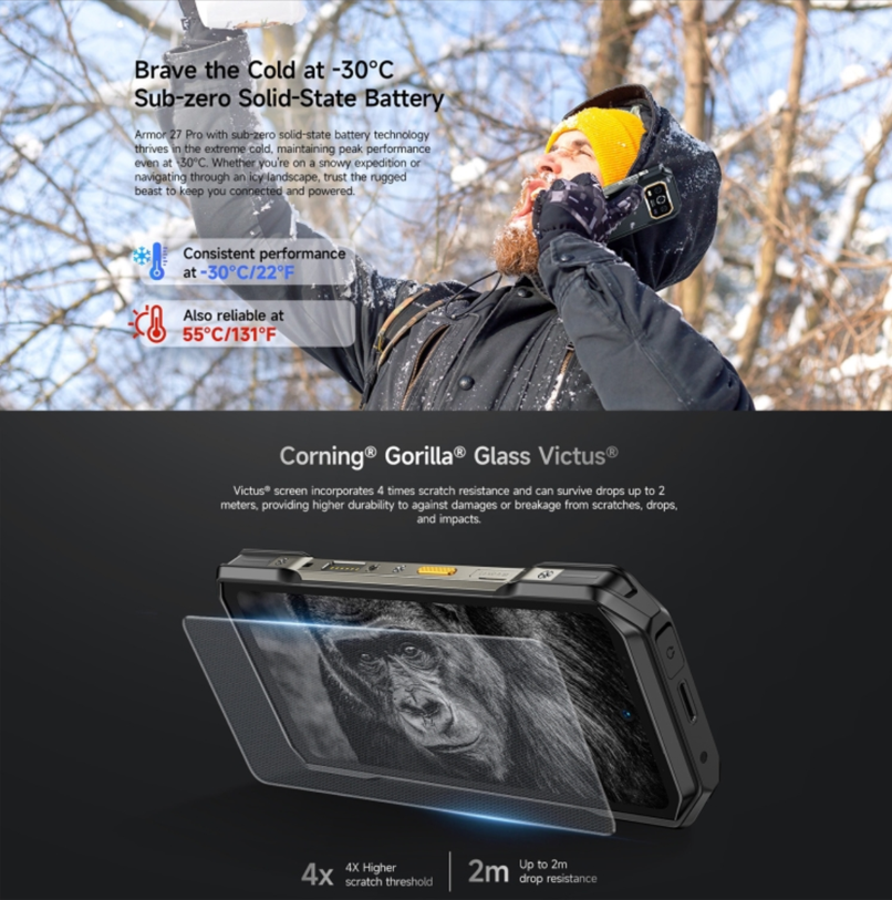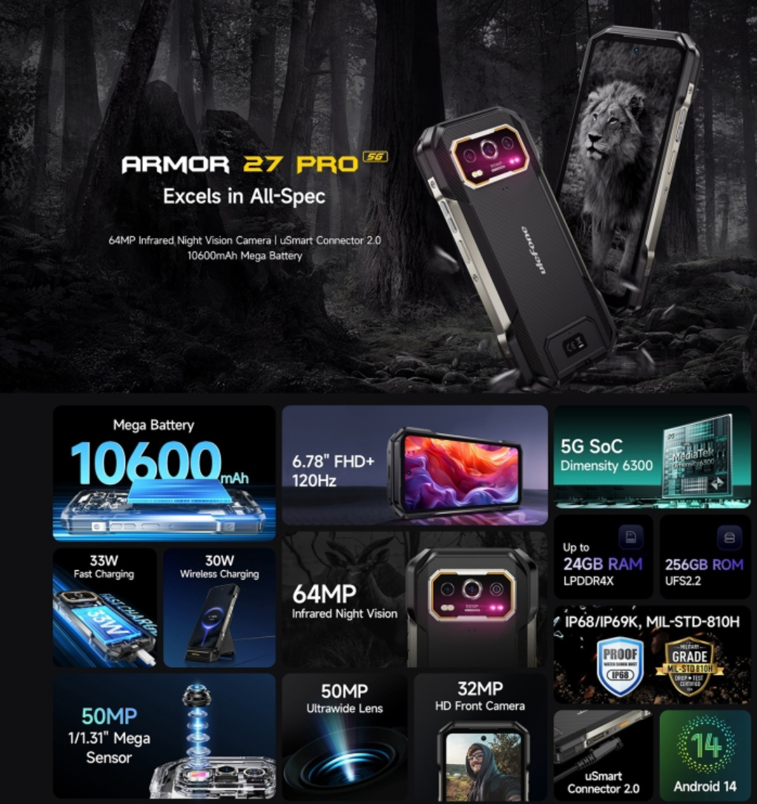 โทรศัพท์มือถือขรุขระขนาด5G ulefone 12 + 256GB ARMOR 27 Pro Android 15 6.78 ''FHD + MTK6300แบตเตอรี่10600mAh 120Hz NFC OCTA Core GAMING