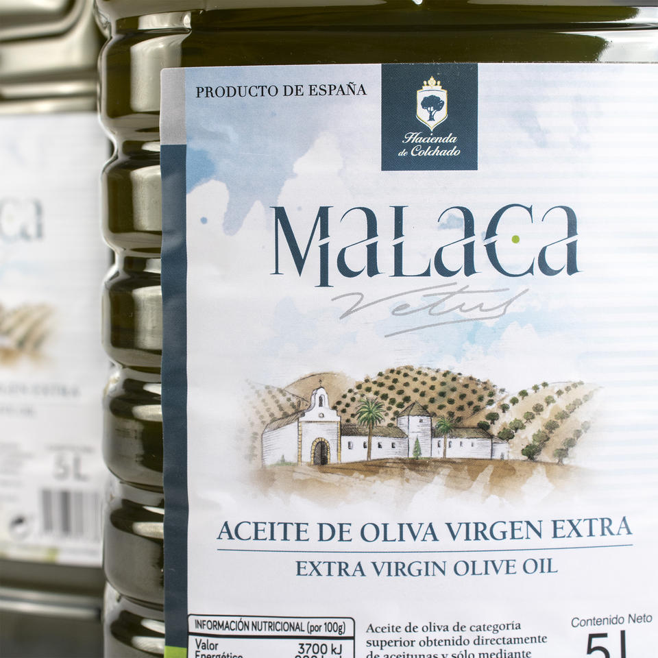 น้ำมันมะกอกบริสุทธิ์ Malaca vetus coupage hojiblanca Picual จากสเปนสำหรับทำอาหารและแต่งตัวสำหรับ horeca 5L