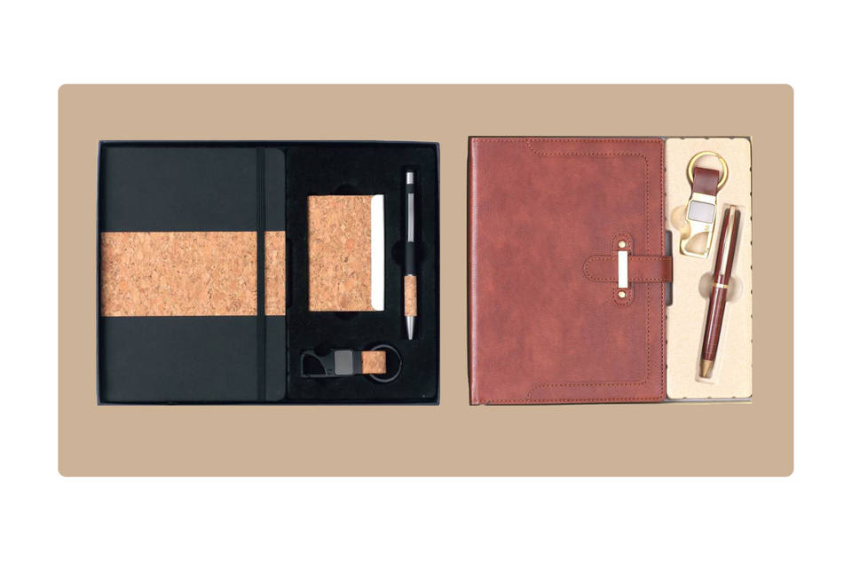 ชุดของขวัญบริษัทหนัง PU ลายนูนแบบกำหนดเอง 5 ชิ้น ประกอบด้วยสมุดบันทึก ปากกา พวงกุญแจ ขวดน้ำ ร่ม พร้อมกล่องของขวัญสีตามสั่ง