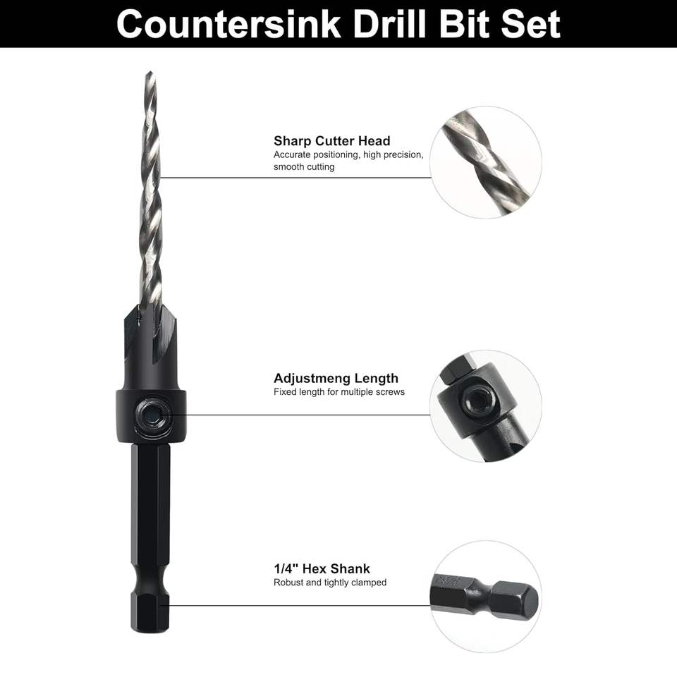 ชุดดอกสว่านเจาะไม้แบบหัวจม 5 ชิ้น คุณภาพสูง ดอกสว่านนำร่องสำหรับสกรู ปรับความลึกได้ ด้ามหกเหลี่ยม 1/4 นิ้ว