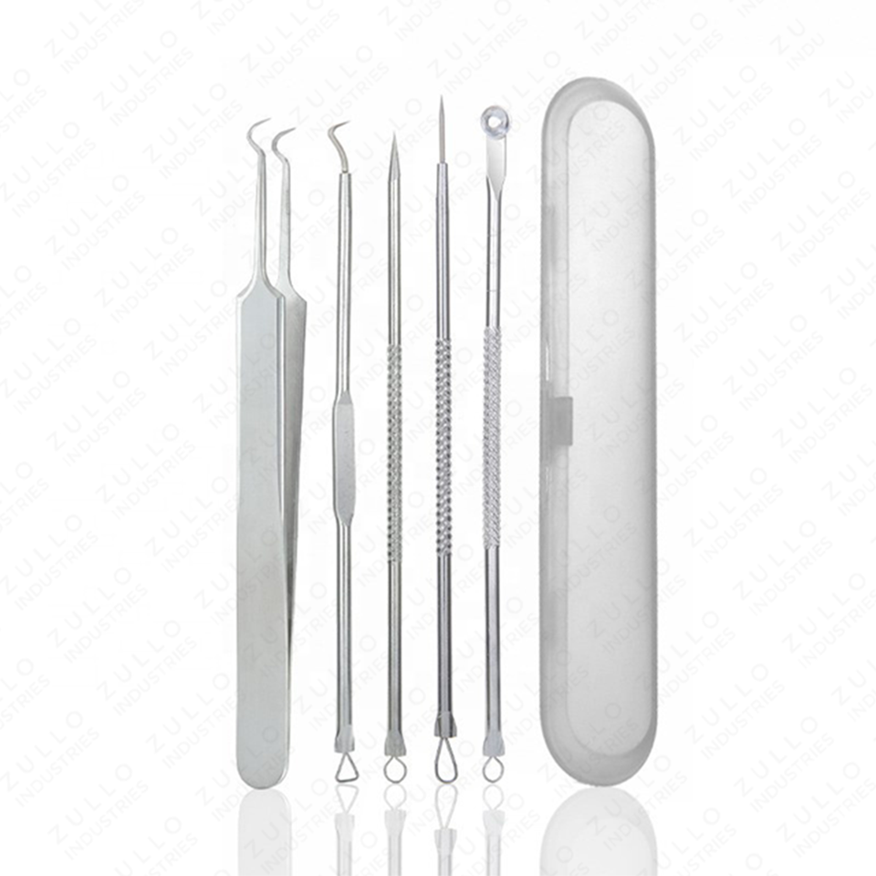 ชุดอุปกรณ์กำจัดสิวเสี้ยนและสิวอักเสบสแตนเลส 5 ชิ้น พร้อมโลโก้และดีไซน์ตามสั่ง ชุดเครื่องมือทำความสะอาดรูขุมขนระดับมืออาชีพ พร้อมกล่องเก็บ