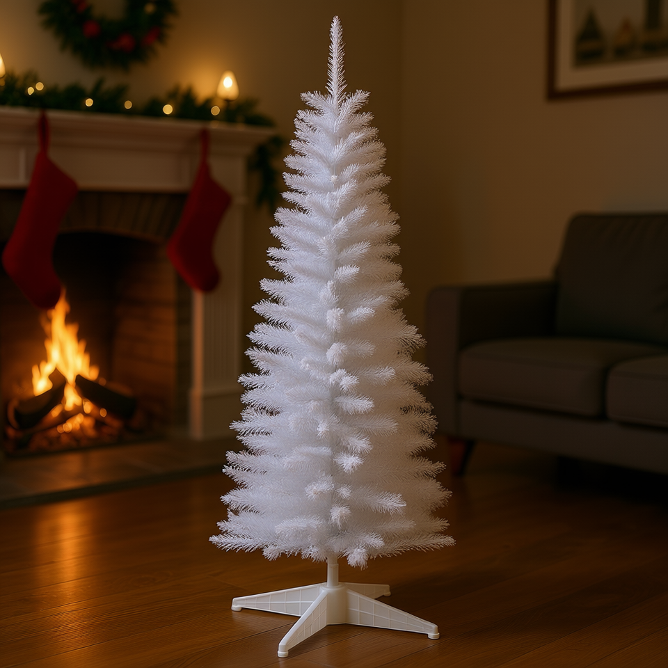 ต้นคริสต์มาสสีขาวทรงเพรียวบาง ขนาด 5 ฟุต แบบดินสอ สำหรับตกแต่งภายในบ้าน ฐานพลาสติกพับได้