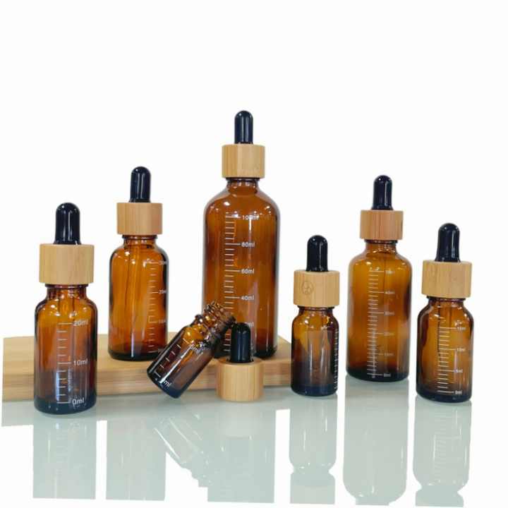 ขวดแก้วสีน้ำตาลอำพันขนาด 5 มล. 10 มล. 15 มล. 20 มล. 30 มล. 50 มล. 100 มล. สำหรับน้ำมันหอมระเหย พร้อมฝาหยดไม้ไผ่
