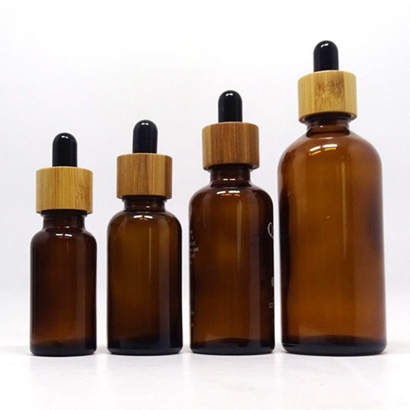 ขวดแก้วหยดน้ำมันหอมระเหยสีชาใสขุ่น ขนาด 5 มล. 10 มล. 15 มล. 30 มล. 50 มล. 100 มล. พร้อมฝาไม้ไผ่ รับทำโลโก้ตามสั่ง ขวดเซรั่ม