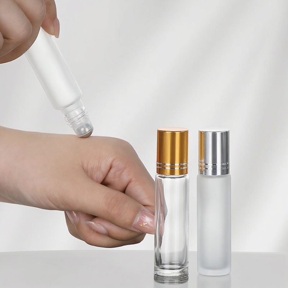 ขวดโรลเลอร์เปล่าทรงกลมขนาด 5 มล. 10 มล. 15 มล. พร้อมฝาสีทอง ขวดแก้วโรลเลอร์สำหรับน้ำมันหอมระเหยแบบเติมได้ สำหรับใช้ในบ้านและการเดินทาง