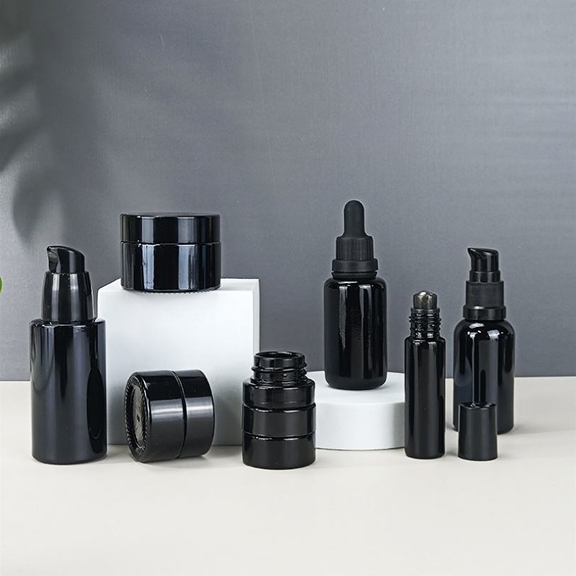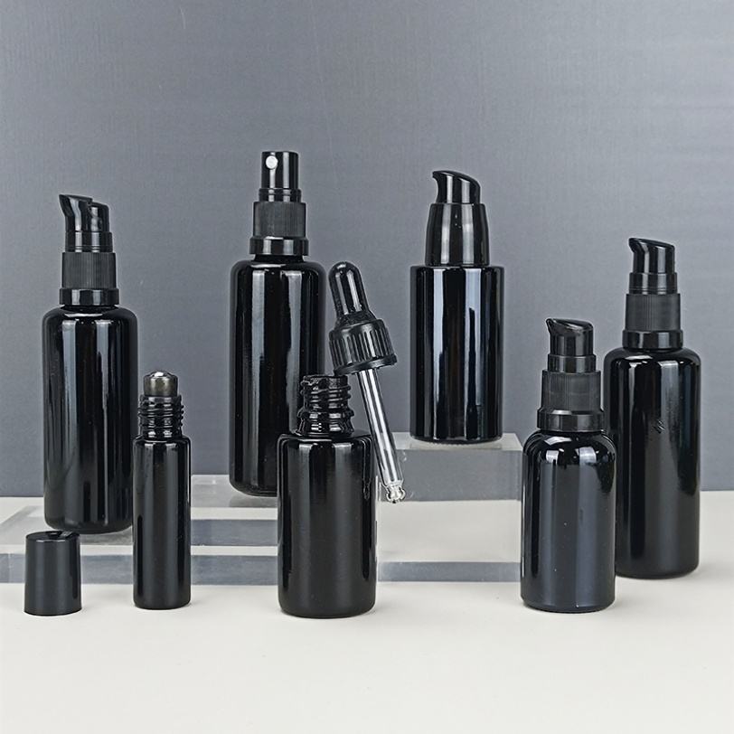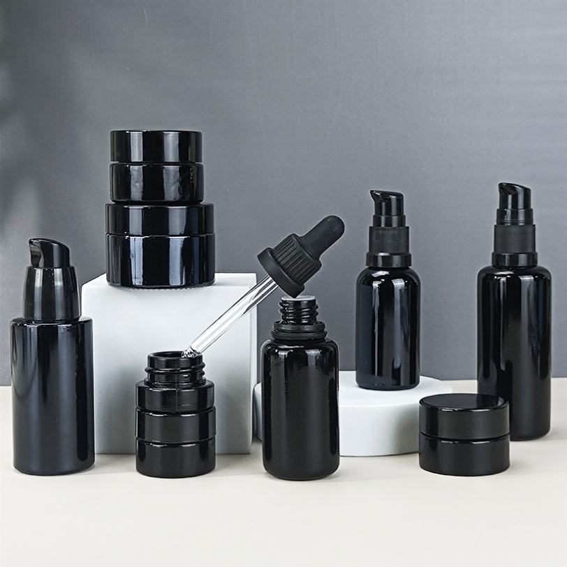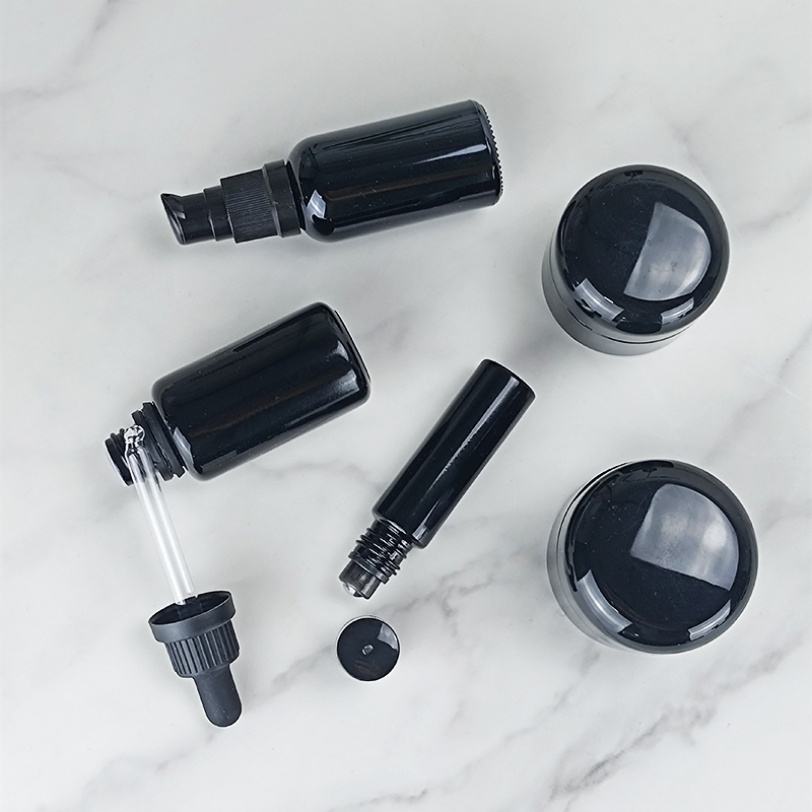 ขวดและกระปุกแก้วสีดำเข้ม ป้องกันรังสียูวี สำหรับน้ำมันหอมระเหย โลชั่น และเครื่องสำอาง ขนาด 5 มล. 15 มล. 30 มล. 50 มล. 100 มล. 150 มล. 200 มล. 250 มล.
