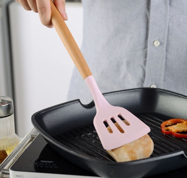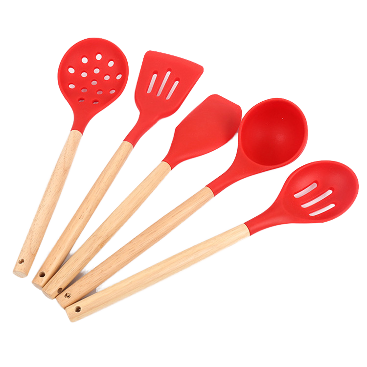 ชุดอุปกรณ์ครัวซิลิโคนทนความร้อน 5 ชิ้น พร้อมด้ามจับไม้ ผลิตในจีน เป็นมิตรกับสิ่งแวดล้อม