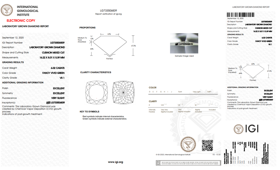 เพชรทรงคุชชั่น 6.02 กะรัต สีเขียวสดใส แฟนซี ไดมอนด์เพาะเลี้ยงในห้องปฏิบัติการ รับรองโดย IGI ขัดเงา ความแข็ง 10/10 สำหรับแหวนหมั้น คุณภาพเยี่ยม