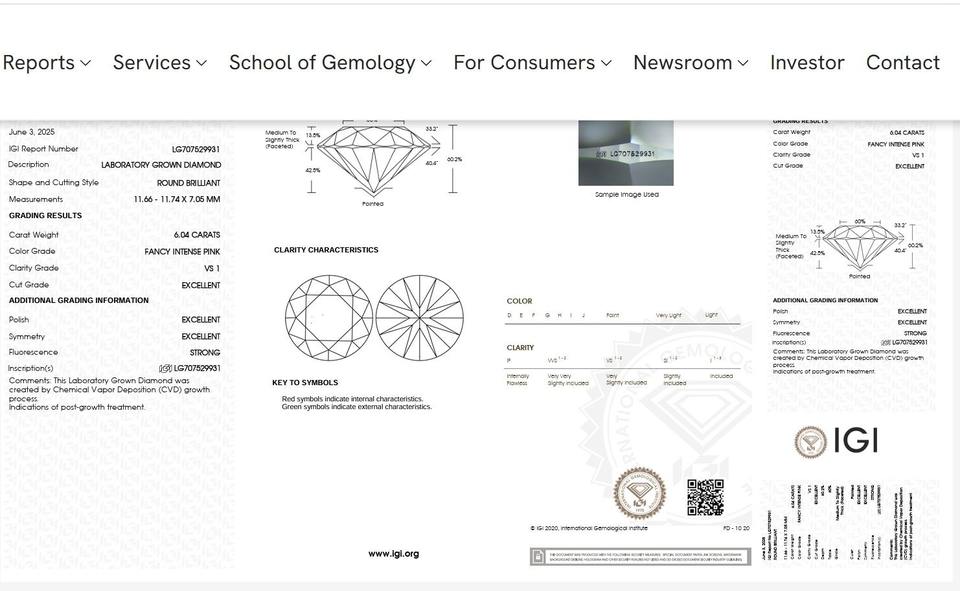 เพชรทรงกลมสีชมพูเข้ม 6.04 กะรัต ระดับความสะอาด VS1 คุณภาพการเจียระไน Excellent ผลิตด้วยวิธี CVD ได้รับการรับรองจาก IGI สำหรับงานเครื่องประดับสั่งทำระดับหรู