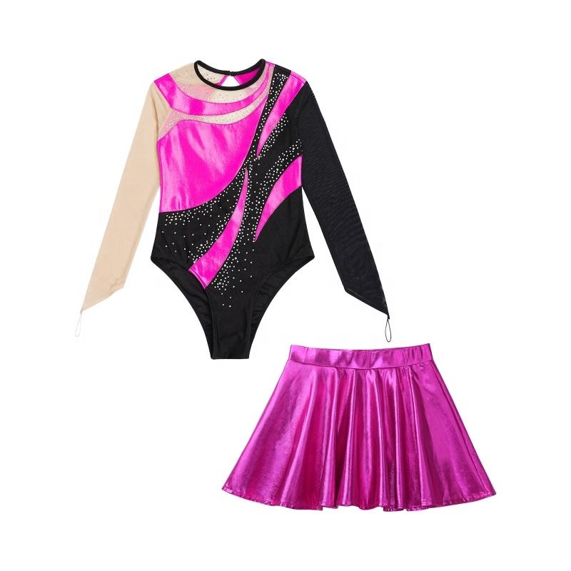 ชุดเต้นลาตินสำหรับเด็กผู้หญิงอายุ 6-14 ปี ชุดยิมนาสติก ชุดเต้นรำ ชุดลีโอตาร์ด พร้อมกระโปรงเมทัลลิก สำหรับการเต้นและการฝึกซ้อมฟิกเกอร์สเก็ต