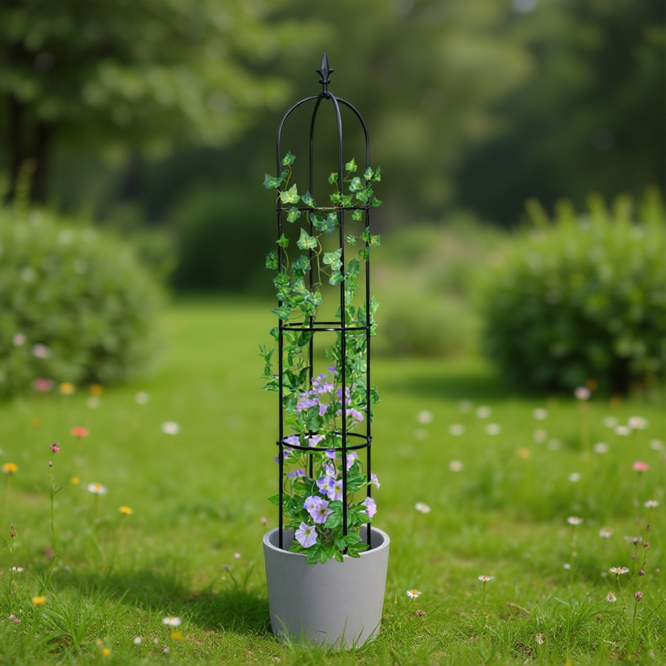 Black Metal Obelisk Trellis Stand 64.2 In Lightweight Coated Garden Tower For Backyards Classic Style