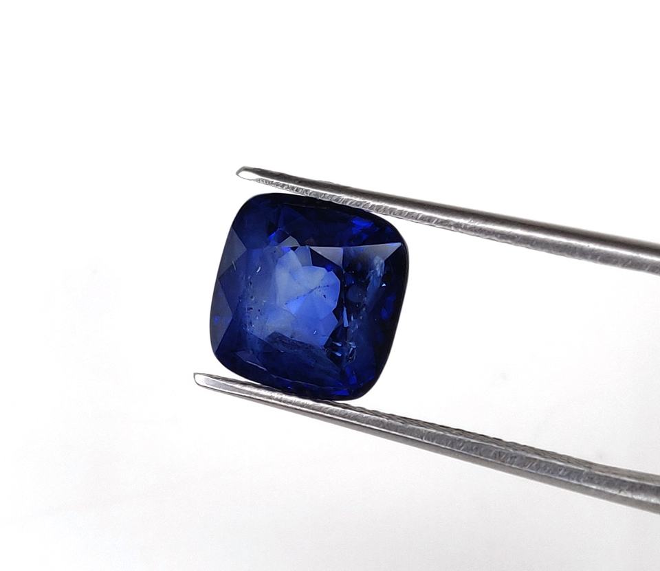 แหวนพลอยไพลินสีน้ำเงินเข้มธรรมชาติคุณภาพสูง 6.47 กะรัต ทรงคุชชั่น รุ่นราชี ราตัน ขนาดแหวนสำหรับเดือนกันยายน หินประจำเดือนเกิด โหราศาสตร์ แบรนด์ลาลาส