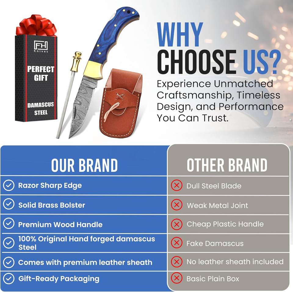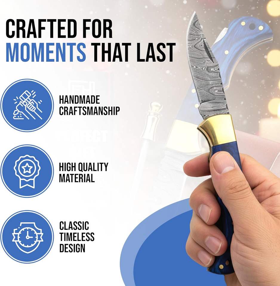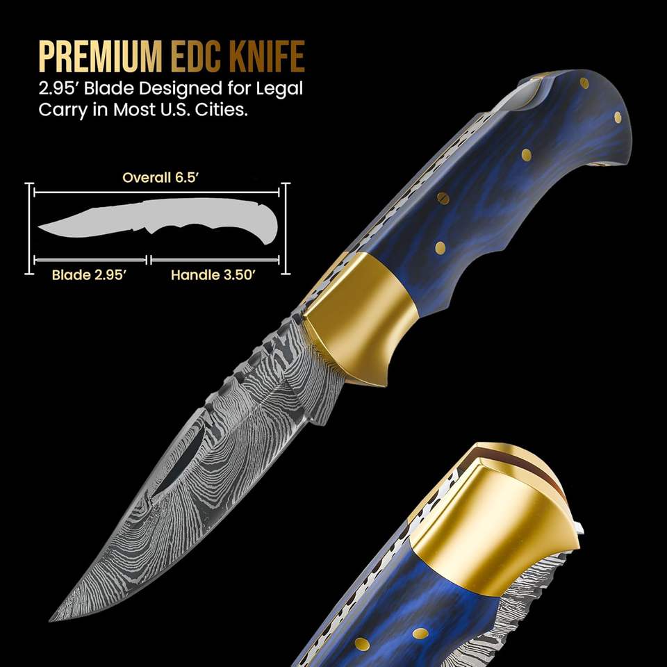 มีดพับเหล็กดามัสกัสเกรดอุตสาหกรรม ขนาด 6.5 นิ้ว ทำด้วยมือ สำหรับผู้ชาย-พร้อมปลอก มีตัวล็อคด้านหลัง ใช้สำหรับตั้งแคมป์และล่าสัตว์
