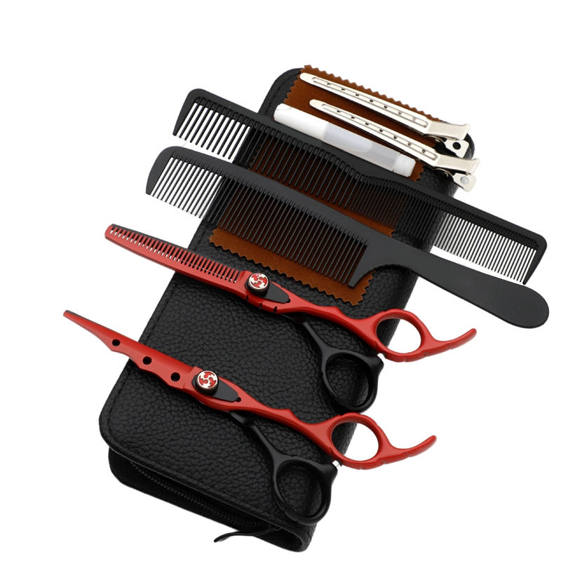 ชุดกรรไกรตัดผมสำหรับมืออาชีพ,ชุดกรรไกรตัดผมสเตนเลสแบบขอบเดียวสีดำ6นิ้วสีแดง
