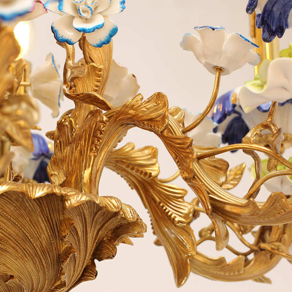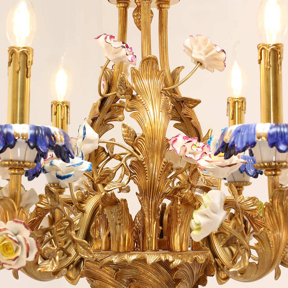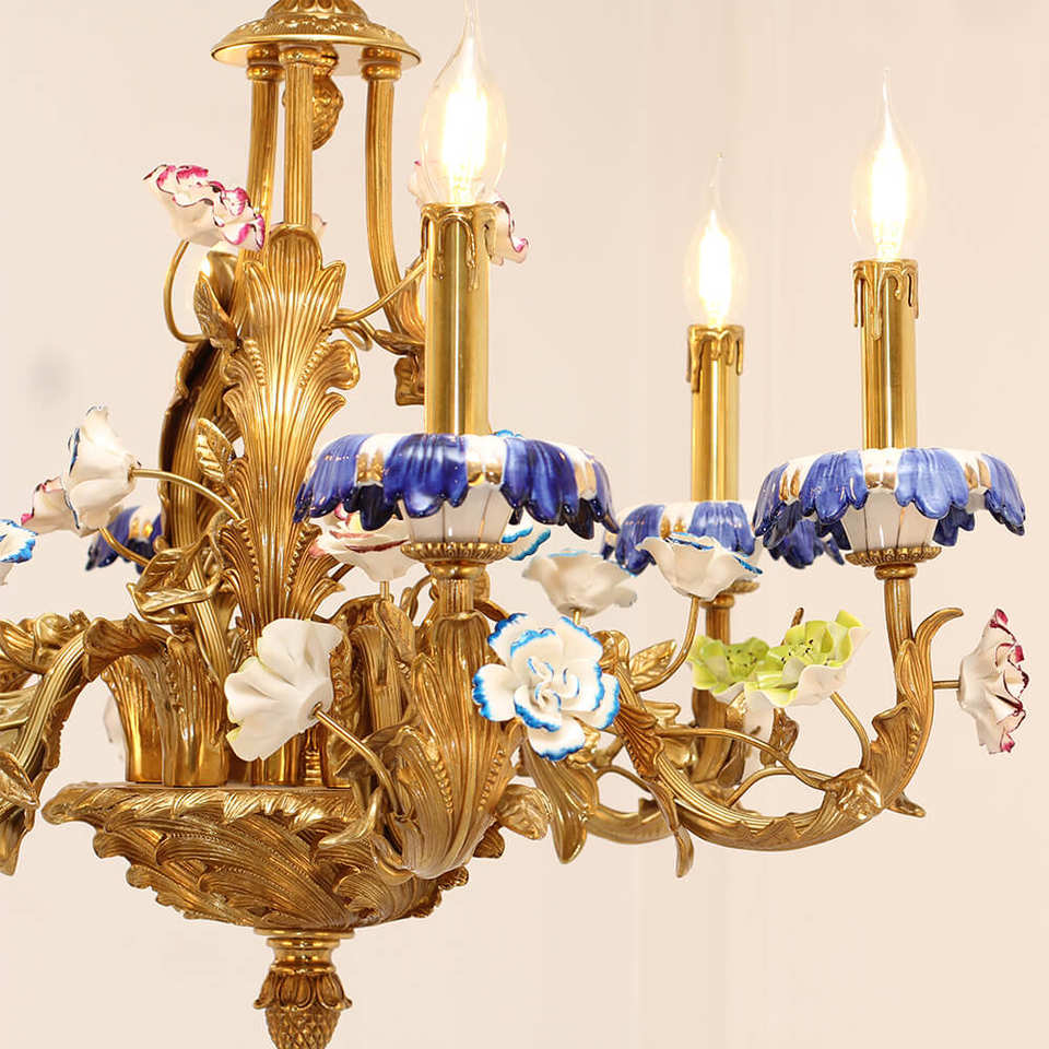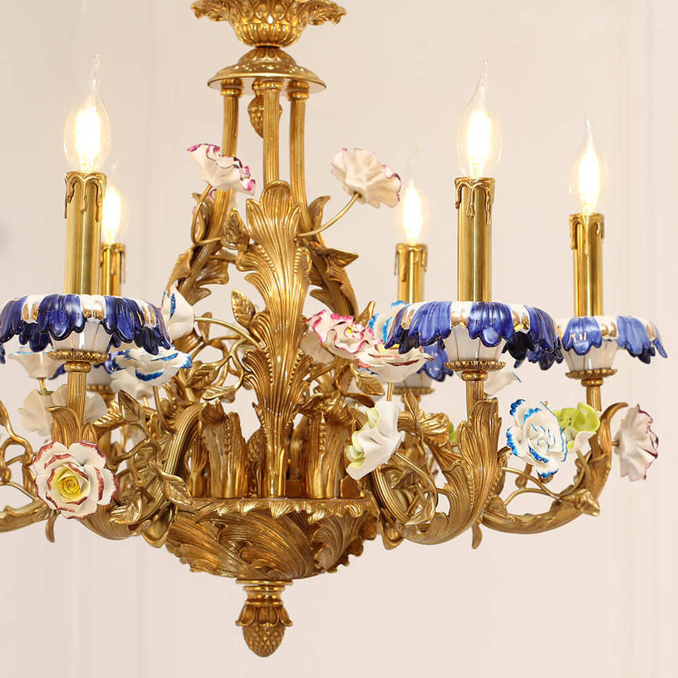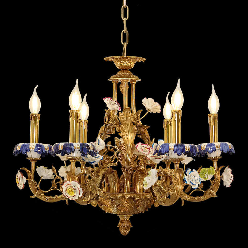 โคมไฟระย้าทองเหลืองลายคราม6ดวงโคมระย้าทองเหลืองสไตล์ฝรั่งเศสพร้อมดอกไม้พอร์ซเลน