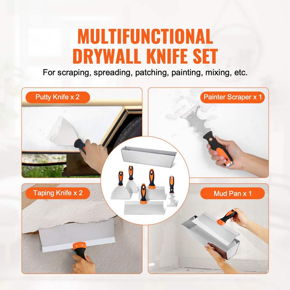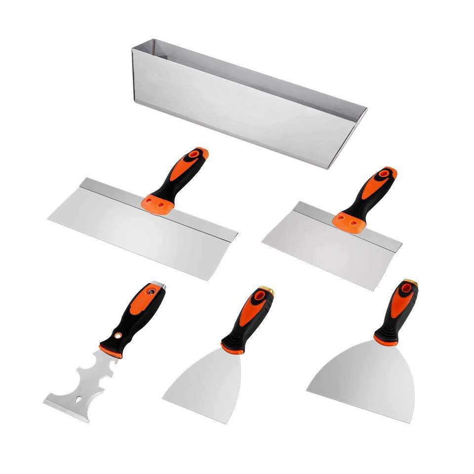 ชุดมีดฉาบผนัง 6 ชิ้น ขนาด 12 นิ้ว พร้อมถาดผสมปูน 3 นิ้ว มีดขูดสี 2 ชิ้น และมีดฉาบและติดเทป ทำจากสแตนเลส