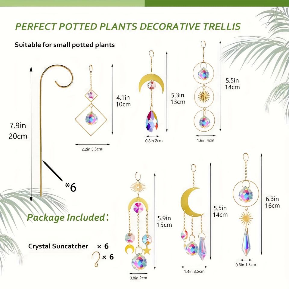 ชุดเสาค้ำต้นไม้ขนาดเล็ก 6 ชิ้น ทำจากวัสดุ EVA พร้อมคริสตัลหลากสีสันสำหรับดักแสงแดด - เสาค้ำขนาด 8 นิ้ว สำหรับปลูกต้นไม้ในร่ม/กลางแจ้ง